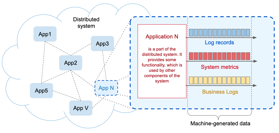 Modern distributed information systems have hundreds or even thousands of the system components(applications). Each component generates information in the form of application logs. There are also some metrics that can be monitored and recorded in real-time, known as machine-generated data, which are streaming in nature.