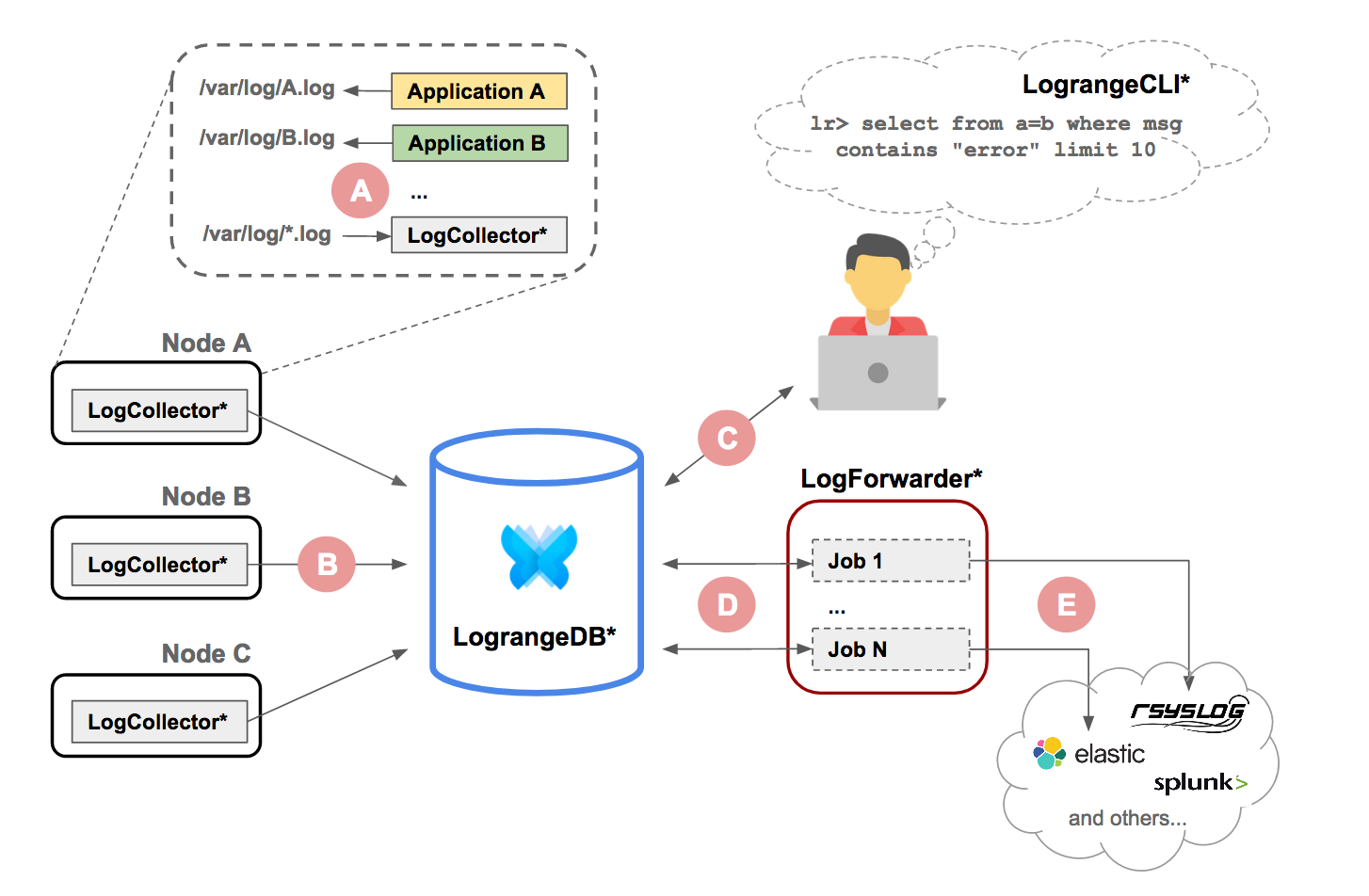 LogCollector - logs collecting agent, collects log data (A) on a given source (node, VM, container) and sends it (B) to LograngeDB;