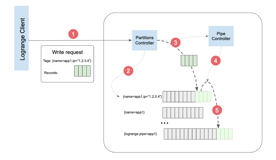 Every write operation to any partition is checked against knonwn pipes. A pipe is triggered if its source filter matches tags from the write operation W. The triggered pipe allows to write one or all records from W to the partition tagged by {logrange.pipe=<pipe name>}