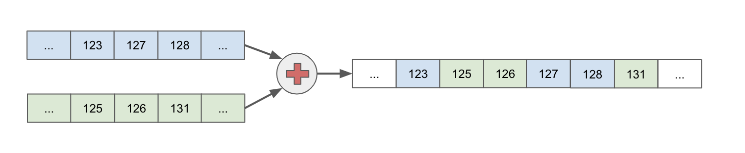 On the picture there are 2 streams of records are merged by the timestamps values (relative numbers in boxes)