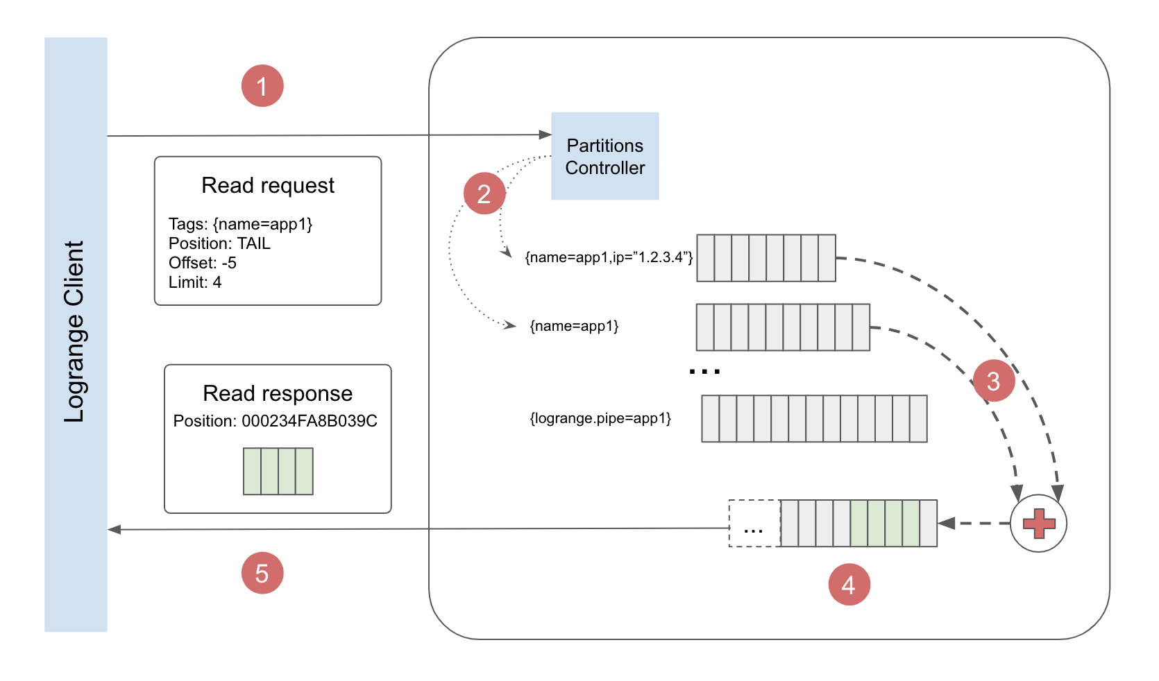 {name="app1",ip="1.2.3.4"}. In the example the partition already exists and contains some data. If the partition doesn't exist the Partition Controller will create it.{logrange.pipe="app1"}. Pipe Controller initiate the writing process.{name="app1",ip="1.2.3.4"} is copied to the partition {logrange.pipe="app1"}Read Operation intended to obtain records from one or many partitions. Opposed to a Write operation the Read one can read records from multiple partitions. Some stream merge will be needed this case.